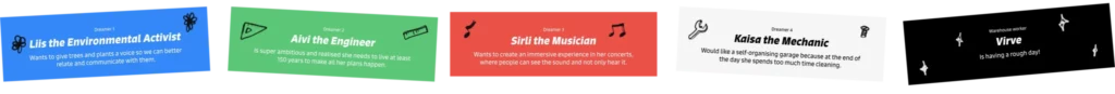 Ehitasime koolitusprogrammi üles elamusmänguna neljas vaatuses, mis viis osalejad väljamõeldud maailma. Peategelased selles olid: